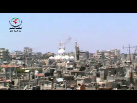 حمص المحاصرة لحظة ضرب مأذنة جامع الصحابي خالد بن الوليد محاولة اسقاطها 5 7 .. الله اكبر حمص تحت النار تدك بالاف القذائف